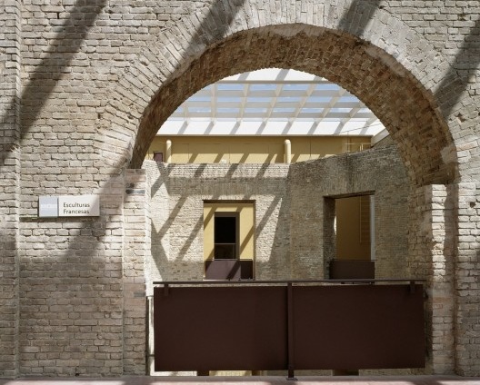 Os pátios abertos são transformados em salões interiores de pé-direito triplo, protegidos por diáfanas coberturas planas de vidro, que apesar de parciais, sugerem o "empacotamento" do edifício e insinuam sua catalogação. Com a retirada das esquadrias diminui o aspecto exterior de fachada das paredes e dramatiza-se o aspecto de ruína das aberturas e a continuidade do piso de granito do piso inferior somado à passarela nos dois níveis reforçam a ambivalência entre interior e exterior.