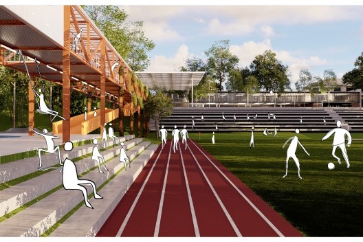 Partido de implantação consistente que entende a dinâmica das atividades da Liga e da comunidade colocando o campo como protagonista, além de propor conexões bem resolvidas com qualidade técnica e de desenho.